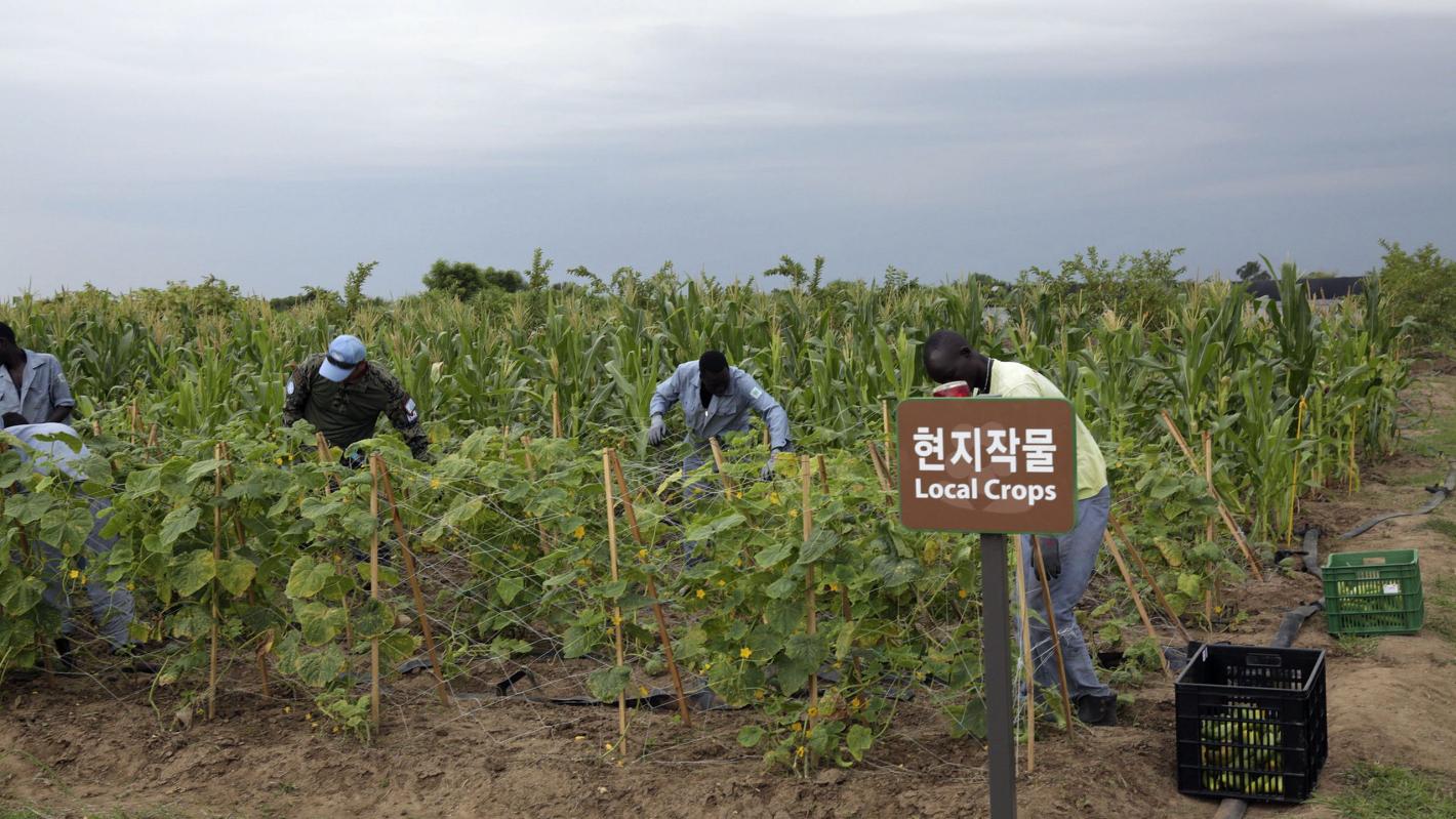 Dark rain clouds hang over a seven-acre field of crop and green houses, located in an area in Bor, where South Korean peacekeepers serving the United Nations Mission in South Sudan have turned fallow land into a productive…