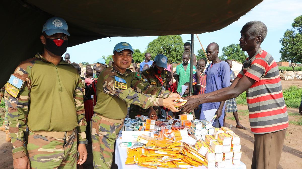 UNMISS peacekeepers from Bangladesh vaccinate livestock and distribute hygiene kits among local communities in Wau to ensure the safety of people and their animals during COVID-19. Cattle rearing is a source of livelihood for…