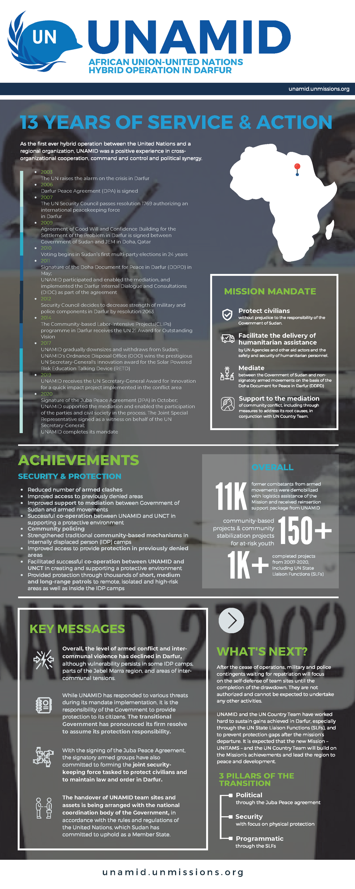 On 29 June 2017 Resolution 2363 (2017) was adopted by the Security Council which, in addition to renewing the mission’s mandate, decided to draw down UNAMID’s troop and police strength over the next year in two phases, while closely monitoring the situation on the ground. UNAMID ended its activities on 31 December 2020.