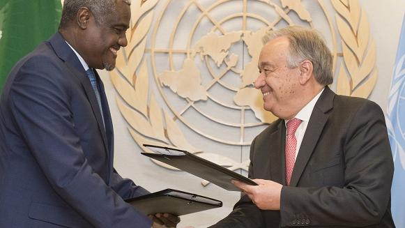 On 19 April 2017, the United Nations (UN) Secretary-General and Chairperson of the African Union (AU) Commission signed the Joint UN-AU Framework for Enhanced Partnership in Peace and Security, during the first United Nations-African Union Annual Conference, at UN headquarters in New York. This Framework serves as a as a basis for collaboration through joint mechanisms and regular consultations. In a Joint UN-AU Communiqué SG/2239 on the same date, the Secretary-General and the Chairperson reiterated their strong commitment to working hand in hand towards achieving the continent’s development goals.