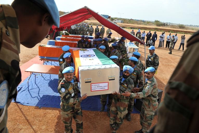 Indian peacekeepers loading the casket of the late Lt. Col. Mahipal Singh, one of five UNMISS Indian Battalion soldiers who were killed in an ambush on 9 April by heavily armed assailants on the road between Gumuruk and Bor…