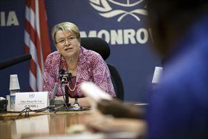 Yasmina Bouziane (UNMIL Spokesperson) Good morning ladies and gentlemen of the press. Thank you for coming to this press conference with the Special Representative of the Secretary-General, Madam Ellen Margrethe Løj. Yasmina…