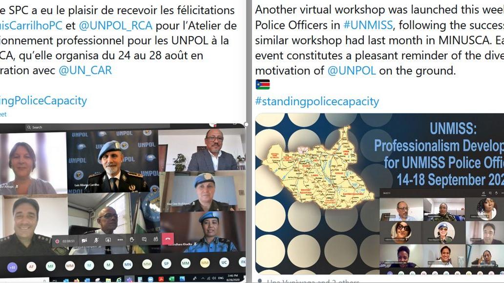 A team of United Nations Police Division staff members from the Standing Police Capacity (SPC) and the Strategic Policy and Development Section developed and conducted two virtual workshops on professional development for UN Police (UNPOL) officers serving in the United Nations Multidimensional Integrated Stabilization Mission in the Central African Republic (MINUSCA) from 24 to 28 August 2020 and in the United Nations Mission in South Sudan (UNMISS) from 14 to 18 September 2020. Over 80 UN Police officers from both missions, 70% of whom were women, participated in the workshops.