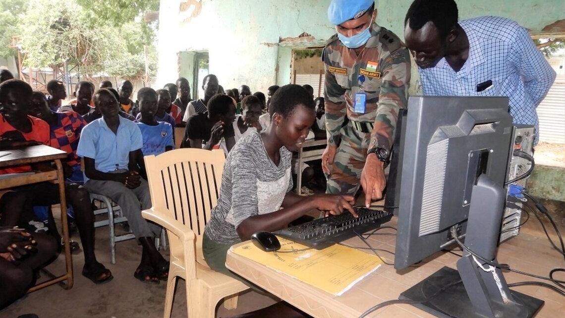 Indian peacekeepers in Malakal teach computer skills to pupils at Bander Primary School