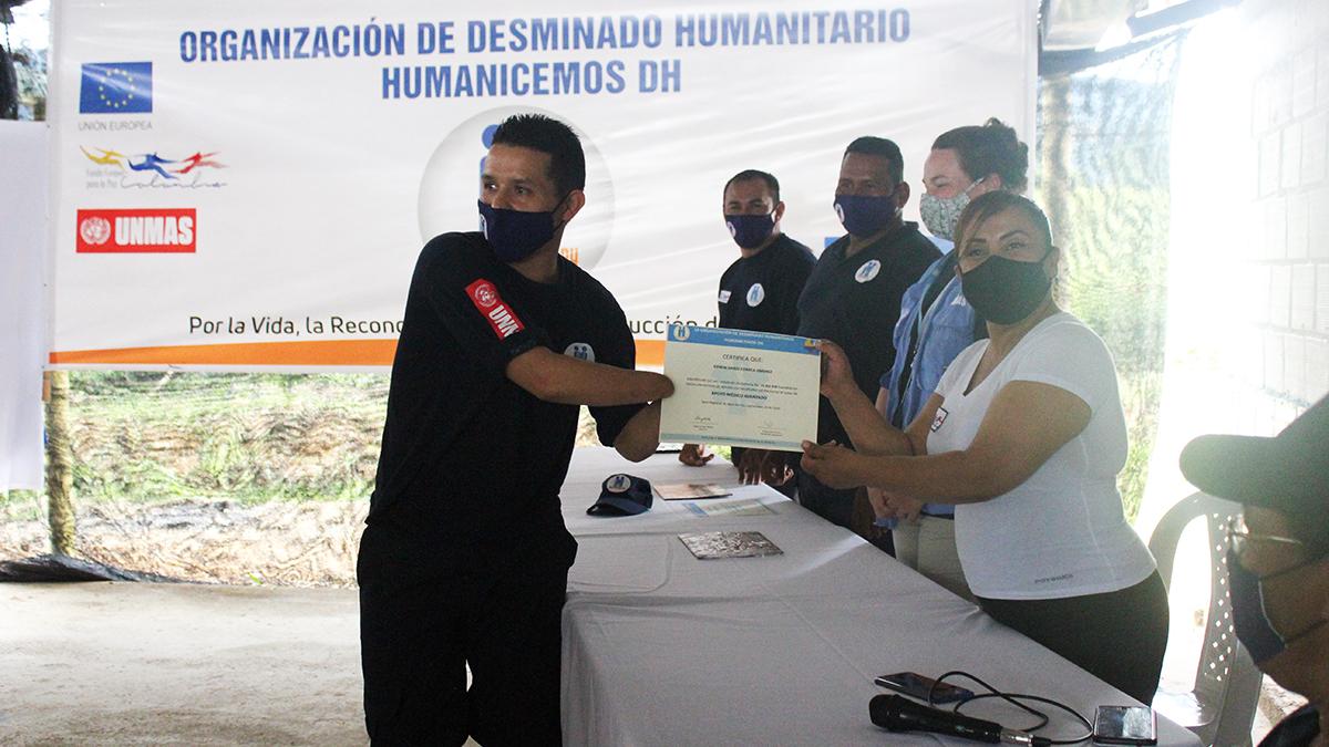 After three years of training provided by UNMAS Colombia, in August 2020, Edwin became one of the first 17 ex-combatants certified by the national mine action authority to carry out humanitarian demining tasks as a supervisor and he received the level 1 certification for explosive ordnance disposal. His physical disability has not been a barrier.