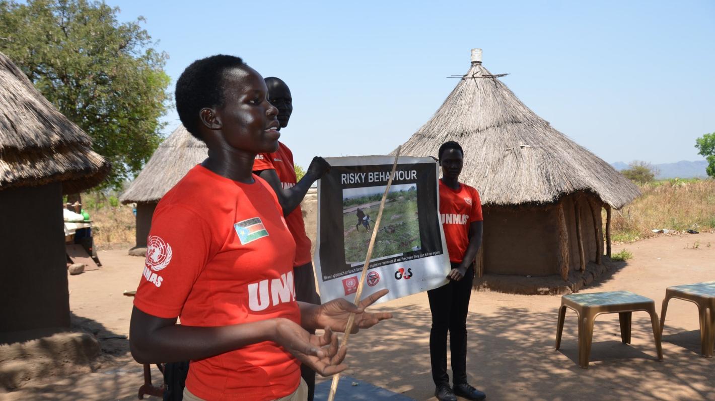 (Mary Arok delivering a training session on explosive ordnance risk education in Birisi village, in the southern part of South Sudan. Copyright: UNMISS)