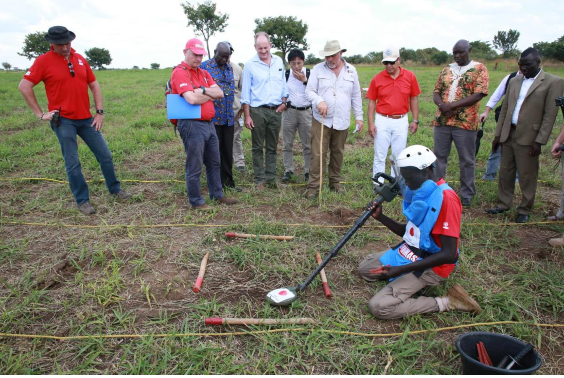 In 2019, funded by the Government of Japan, UNMAS surveyed and cleared large agricultural areas in Eastern Equatoria. A deminer demonstrated the methodology for detection and clearance of a cluster munition during a high-level delegation site visit. Photo: UNMISS.