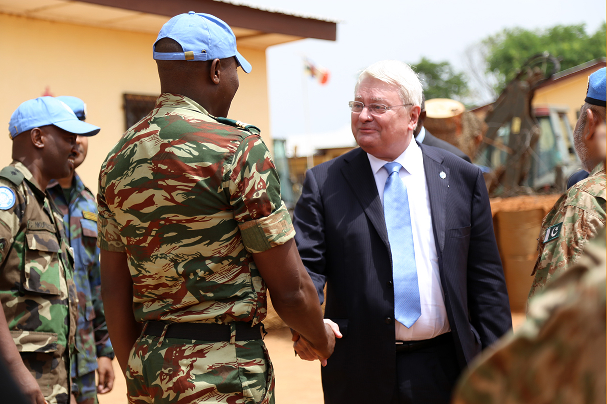Mr. Hervé Ladsous greeting UN peacekeepers during his visit to the Central African Republic (CAR). UN Photo/Jean Claude Bitsure