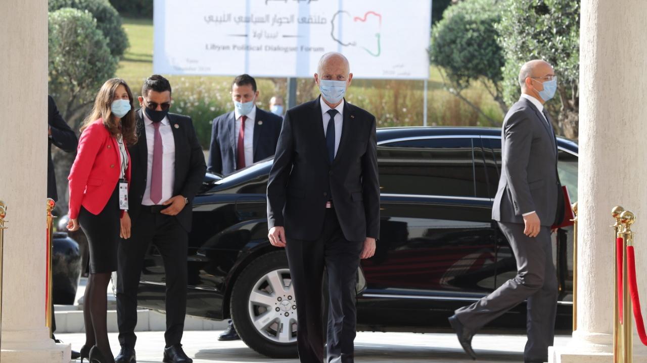 Arrival of the Tunisian president Kais Saied at the plenary hall of the Libyan Political Dialogue Forum (LPDF) at Foor Seasons Hotel, Tunis, where he was welcomed by the Actin Special Representative of the UN Secretary-General in Libya Stephanie Williams