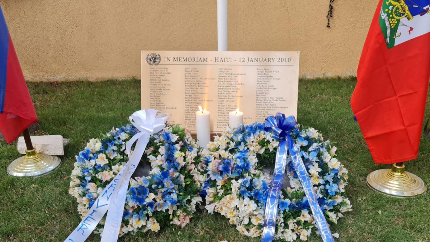 La Cheffe du Bureau Intégré des Nations Unies, María Isabel Salvador a ensuite invité l’assistance à observer une minute de silence en mémoire des victimes et a ensuite déposé une gerbe de fleurs sur la plaque ou sont inscrits les noms des collègues des nations Unies qui ont perdu la vie lors du séisme du 12 janvier 2010.