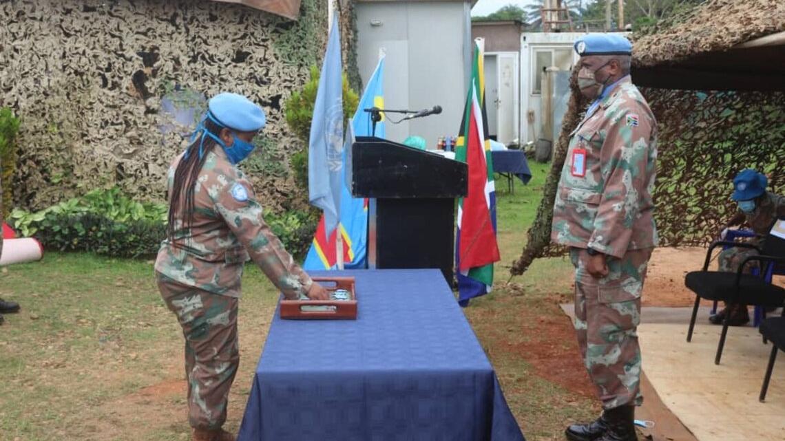 Huit cent (800) membres des Forces de Défense Nationale Sud-africaines, dont 100 femmes soldats, ont reçu les médailles des Nations Unies après 12 mois de services rendus à la Mission des Nations Unies pour la Stabilisation en République Démocratique du Congo (MONUSCO), au sein de la Brigade d'Intervention de la Force de la Mission ( FIB).