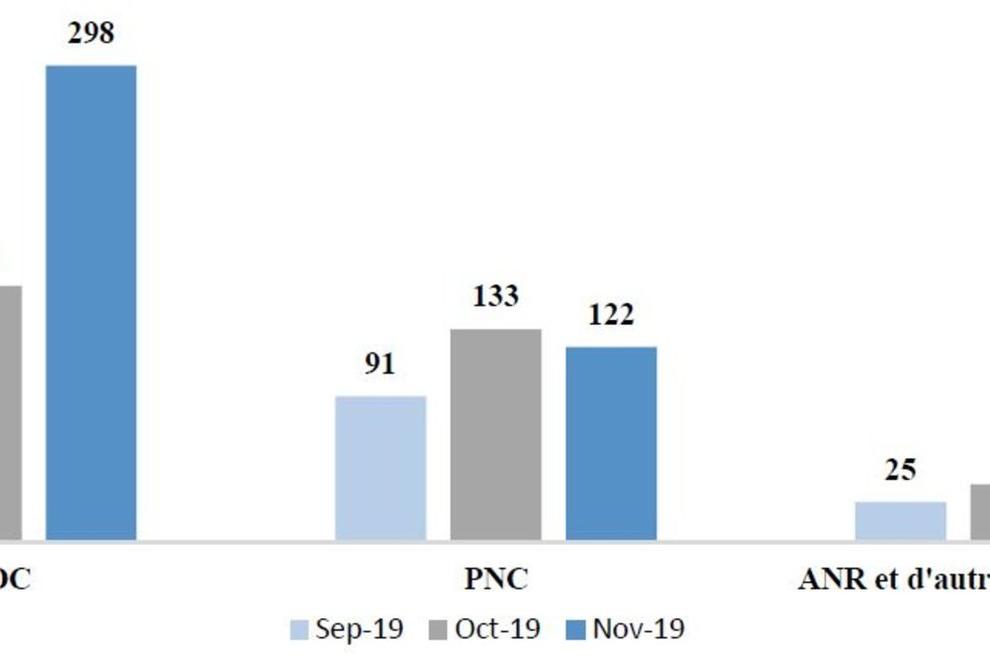 Durant le mois de novembre 2019, le BCNUDH a documenté 846 violations des droits de l’homme sur tout le territoire de la RDC2, soit une augmentation de 41% par rapport au mois d’octobre 2019 (600 violations)3. Cette augmentation reflète une hausse significative du nombre d’atteintes attribuables aux groupes armés (+48%) actifs dans le Nord-Kivu, en particulier des combattants des Allied Democratic Forces (ADF), des Forces démocratiques de libération du Rwanda (FDLR) et des Nduma Defense of Congo-Rénové (NDC-R) qui ont toutes plus que doublées pour le mois de novembre 2019. Le nombre de violations commises par des agents de l’Etat a substantiellement augmenté par rapport au mois précédent (+26%) et ces derniers demeurent responsables de plus de la moitié des violations documentées sur l’ensemble du territoire de la RDC.