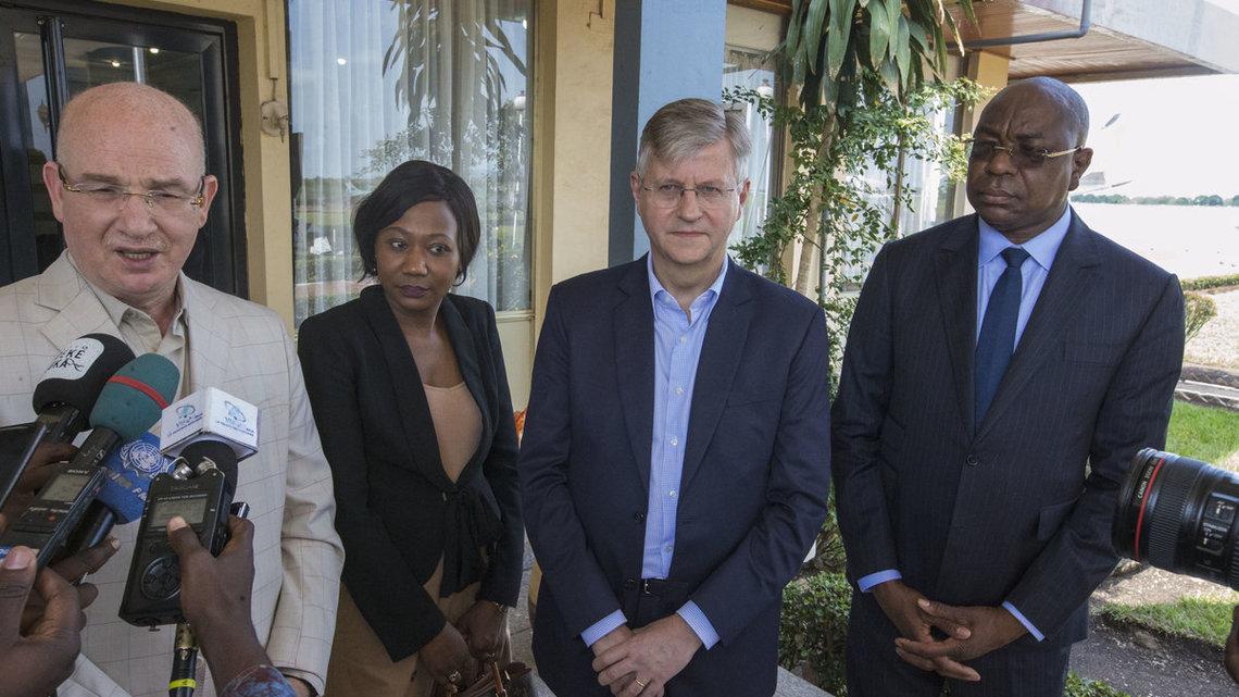 Bonjour à tous, moi aussi je voudrai dire que je suis très heureux de revenir avec mon ami Smail Chergui, de l’Union Africaine, à Bangui. Le maître mot maintenant c’est la mobilisation de tous pour avancer rapidement dans la mise œuvre de l’Accord. Aujourd’hui, il y a une fenêtre d’opportunité, il ne faut surtout pas la laisser se refermer parce qu’elle ne se réouvrirait peut-être pas de sitôt. Et nous sommes là pour aider à cette mobilisation, c’est pour ça qu’avec madame la ministre, avec tout le Gouvernement, bien sûr nous allons rencontrer Son Excellence le Président de la République. Nous allons travailler à la fois ici à Bangui comme l’a dit Smail Chergui avec notamment la réunion du Groupe International et le soutien, mais aussi aller sur le terrain, avec encore une fois, un seul but : c’est faire avancer la mise en œuvre de l’Accord qui nécessite un effort de tous, une mobilisation de tous dans la paix évidemment, parce que la violence est incompatible avec la mise œuvre de l’Accord. Je voudrais aussi dire que cette visite a aussi pour objectif de regarder avec tous les partenaires de la République centrafricaine, comment nous pouvons soutenir le plus vite et le plus efficacement possible la mise en œuvre de tous les éléments clés de l’Accord. Donc nous allons avoir ici à Bangui un dialogue très étroit avec les partenaires, les autres partenaires de la République centrafricaine afin que les soutiens nécessaires soit le plus rapidement mis en œuvre. Merci.