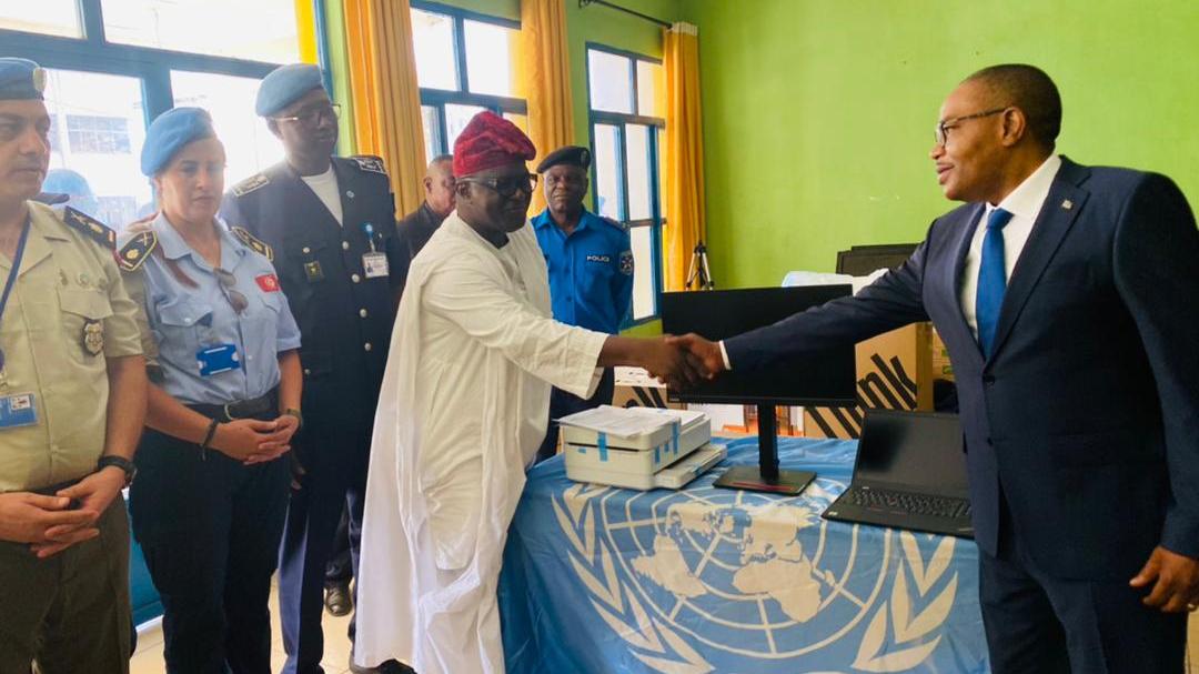 Vingt-cinq (25) ordinateurs fixes, neuf (09) ordinateurs portables, 25 imprimantes, 25 onduleurs et divers accessoires : c’est le matériel informatique remis jeudi 16 juin à la Police nationale congolaise par la MONUSCO, à travers le chef de bureau à Bukavu, Karna Soro. C’est le gouverneur de province, Theo Ngwabidje Kasi, qui a réceptionné le matériel en présence du commandant de la police provinciale, le général Jean-Bernard Bazenge.