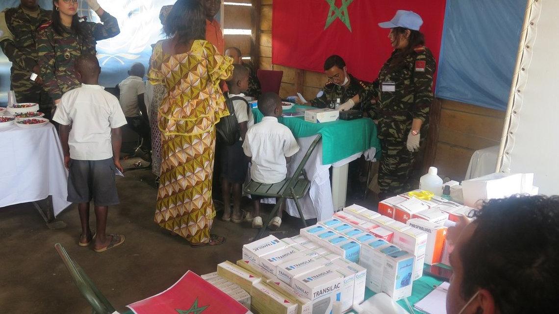 Bunia, le 8 janvier 2020 – Dans le cadre des activités civilo-militaires de la MONUSCO, le contingent marocain de la Force a organisé ce mercredi 8 janvier 2020 des consultations médicales gratuites au Complexe scolaire Sainte Cécile à Bunia. Une centaine d’écoliers de cet établissement (sur les 220 qu’il compte) ont pu ainsi bénéficier gratuitement de consultations médicales, avec prescription et administration de traitements en fonction des résultats des examens. Les consultations portent sur des examens physiques, avec prise de constantes (poids, taille, tension, et température) ; en cas de fièvre, un test rapide de malaria est fait, ainsi que celui de la glycémie ou encore de la saturation en oxygène. Parmi les autres examens dont bénéficient gratuitement ces écoliers, il y a ceux de la gorge, des oreilles, des conjonctives... Parmi les pathologies diagnostiquées, indique le médecin-Capitaine Benali Saad, on retrouve principalement des gastro-entérites, angines, otites, mycoses, ou encore du paludisme.