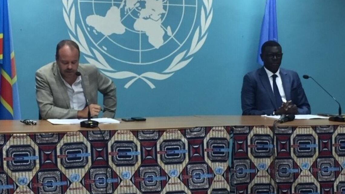 Le porte-parole de la MONUSCO, Mathias Gillmann et le Directeur du Bureau conjoint aux droits de l’homme, Abdoul Aziz Thioye lors de la conférence du 3 février. Photo MONUSCO