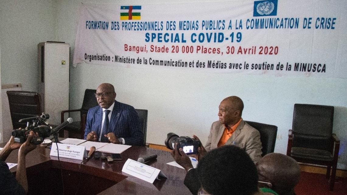 Le Ministre de la communication et des médias, Ange Maxime Kazagui, a présidé la cérémonie d’ouverture de la formation des professionnels des médias publics à la communication de crise relative à la pandémie à COVID-19, ce 30 avril 2020, au Stade 20.000 Places de Bangui, en présence de Charles Antoine Bambara, Directeur de la Communication stratégique et de l’Information publique de la MINUSCA qui soutient l’activité.