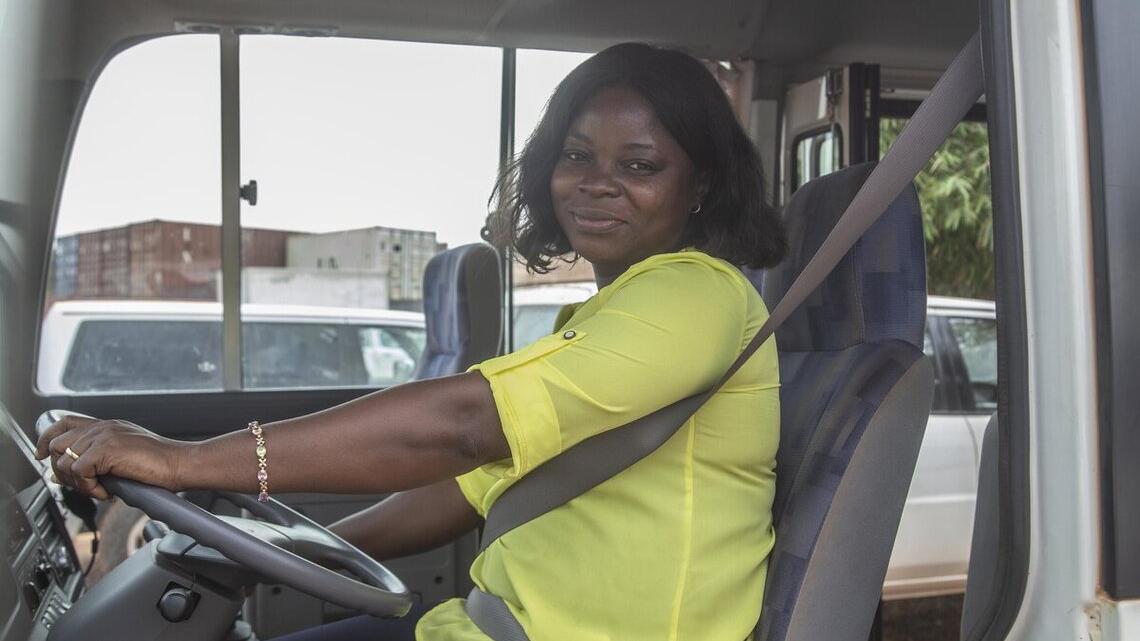 « Quand j'étais encore à la maison et au chômage, je me suis demandée ce que je voulais faire et ce que je savais bien faire. Pour bien faire un travail, il faut d'abord aimer ce que l'on fait et ensuite être soutenu par ce qui nous entoure, alors je me suis dit : je conduis très bien, alors pourquoi ne pas faire de la conduite un métier ? C'est alors que j'ai postulé pour un poste de chauffeur », se souvient Yolande Mazima Yasseko pour qui le choix de devenir chauffeur s'est fait naturellement. Le fait que son superviseur ait apprécié qu'elle fasse partie de cette équipe, auparavant strictement masculine, a renforcé sa confiance dans sa nouvelle profession. Depuis, elle s’y adonne à cœur joie.