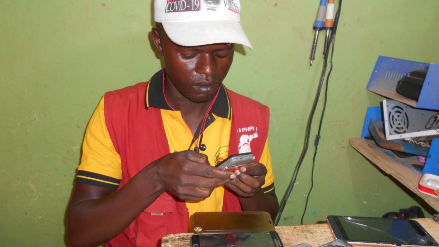 | PORTRAIT |C’est à son second atelier qu’il nous donne rendez-vous ce jour-là : non loin du marché Saïo, en plein Quartier Simbiliabo, dans la Commune de Shari. Ce père de deux enfants n’est pas peu fier du chemin parcouru depuis décembre 2019, date à laquelle il a reçu des mains du Commandant du Secteur nord de la Force de la MONUSCO, en Ituri, son Brevet de fin de formation en réparation d’appareils cellulaires.