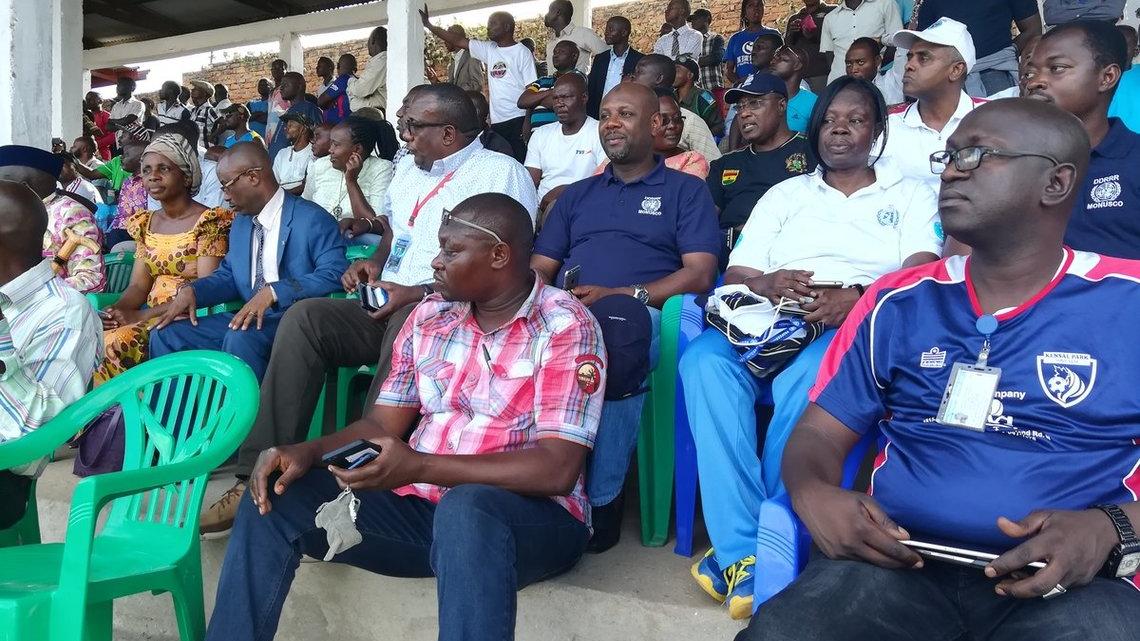 La tribune principale du stade d’Uvira avec les officiels et les representants de la MONUSCO lors du premier match sur la pelouse du stade renové grace au financement de la MONUSCO. Photo MONUSCO/Bilamekaso TCHAGBELE