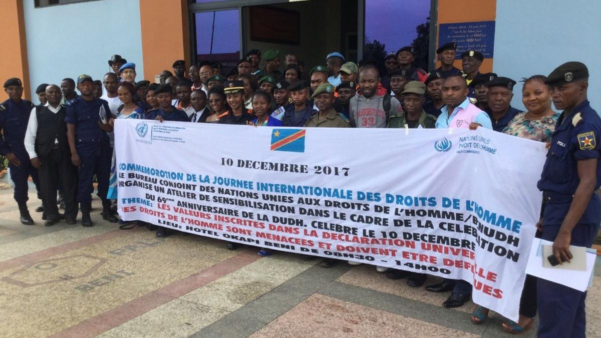le BCNUDH MONUSCO-Beni, a organisé le lundi 18 décembre 2017, à Beni ville, un atelier de sensibilisation sur le thème : Les valeurs inscrites dans la déclaration universelle des droits de l’homme sont menacés et doivent être défendues>. Cet atelier organisé en partenariat avec les organisations de la société civile, des autorités politico administratives et judiciaires avait pour but la commémoration de la journée internationale des droits de l’homme marquant le 69ème anniversaire de la Déclaration Universelle des Droits de l’Homme. Juste après l’hymne national, une minute de silence a été observée en la mémoire des 14 casques bleus tanzaniens tués le jeudi 07 décembre dernier lors d’une attaque de leur base opérationnelle à Semuliki, par des présumés rebelles de l’ADF…