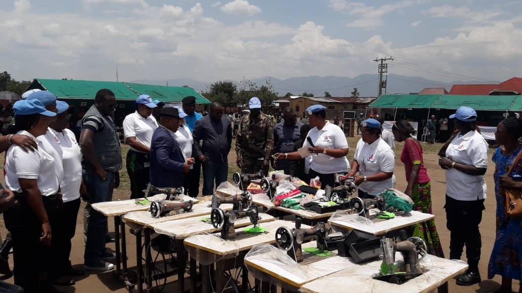Au cours d’une cérémonie au stade Kiwanja, Le Réseau des Femmes UNPOL de la MONUSCO (RFUM) leur a remis dix machines à coudre, déjà installées sur leur table, ainsi que du matériel de couture. Le tout pour un montant de 3 000 dollars américains.