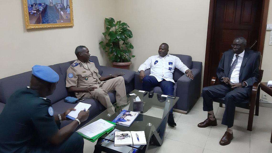 Kinshasa, le 09 Avril 2019 - Le Directeur Général des Migrations (DGM), Monsieur Roland Kashwantale, assisté de son chef de Cabinet Monsieur Charles Kitenge, a reçu dans son bureau le Chef de la Composante Police MONUSCO, le Général Awalé Abdounasir, accompagné pour la circonstance des officiers de police Samba Karim Timbo et Saptebani Cristinel. L’objet de la rencontre portait sur l’instauration d’un cadre de coopération entre leurs deux institutions.