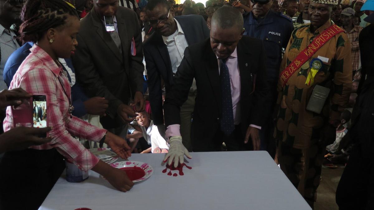 Le Vice-gouverneur du Kasai-Central appose sa "main rouge", symbole de l'engagement contre le recrutement d'enfants dans les groupes armés. Photo MONUSCO/Laurent Sam OUSSOU