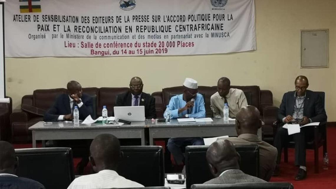 Pour appuyer les efforts du gouvernement, la MINUSCA a organisé un atelier de sensibilisation à l’intention d’une quarantaine d’éditeurs de la presse centrafricaine, les 14 et 15 juin 2019 au stade ‘’20000 places’’ de Bangui.