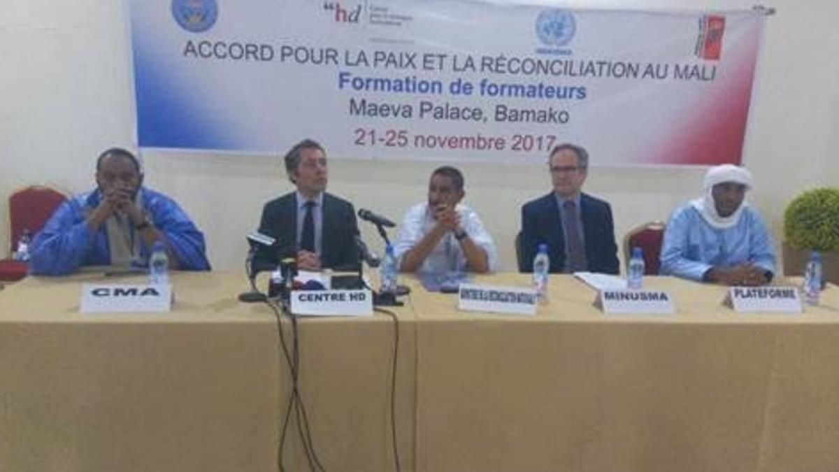 L’hôtel Maeva Palace a abrité ce mardi 21 novembre 2017, la cérémonie de lancement du troisième volet de l’atelier de formation de remise à niveau du vivier des formateurs sur l’accord pour la paix et la réconciliation au Mali issu du processus d’Alger. Organisé par le Centre pour le Dialogue Humanitaire en partenariat avec les Nations Unies, cette cérémonie d’ouverture a été présidée par M. Mohamed El Moctar, Ministre de la Réconciliation Nationale, en présence de M. Koen Davidse, Adjoint du Représentant spécial du Secrétaire général de l’ONU, en charge des Affaires Politique de la MINUSMA, et M. Giuliano Vascotto, Directeur adjoint du Centre pour le Dialogue Humanitaire ainsi que des représentants des mouvements signataires, notamment M. Ibrahima Ould Sidatt et M. Moulaye Ahmed Ould Moulaye, respectivement de la Coordination des Mouvements de l’Azawad (CMA) et de la Plateforme des Mouvements du 14 Juin 2014 d’Alger. Durant cinq jours, les cinquante participants venus principalement des régions du Nord seront sensibilisés aux termes de l’Accord pour la Paix et la Réconciliation au Mali issu du processus d’Alger. Avec l’appui du Centre HD et des Nations Unies, Ils seront amenés à former des équipes conjointes, à la fois inclusives et représentatives des différentes sensibilités du terrain qui seront, à leur tour, chargés de diffuser aux communautés des messages identifiés dans le cadre dudit atelier. Dans son allocution, le directeur adjoint du Centre HD, s’est réjoui de pouvoir, une nouvelle fois, accompagner les acteurs du processus de paix malien. Selon lui, des progrès ont été enregistrés mais ceux-ci restent méconnus des populations, aussi bien au Mali que dans les communautés refugiées ou de la diaspora. Il a terminé ses propos en remerciant le Gouvernement du Mali, le bureau du Haut Représentant du Président de la République pour la mise en œuvre de l’accord ainsi que la MINUSMA, à travers sa section Médiation, pour son partenariat renouvelé qui a permis la tenue effective de l’atelier. Les représentants des mouvements, de leur côté, ont souligné les pas en avant que les trois parties maliennes ont réalisés dans la mise en œuvre de l’accord de paix. Tout en remerciant l’accompagnement de la communauté internationale, ils ont évoqué qu’encore beaucoup reste à faire pour achever le processus de paix au Mali. A ce sujet, ils ont mis l’accent sur l’examen de certaines matières spécifiques telles que les reformes législatives portant sur la décentralisation et sur les élections. L’Adjoint du Représentant spécial du Secrétaire général des Nations Unies pour les Affaires Politiques de la MINUSMA, dans une brève allocution, s’est dit honoré d’être avec l’ensemble des acteurs du processus de paix pour parler de la dissémination de l’accord. Il a salué les efforts consentis par le Gouvernement du Mali et les mouvements signataires pour une bonne mise en œuvre de l’accord. M. Koen Davidse a invité les bénéficiaires à jouer leur rôle de dissémination de l’accord et ce, partout où besoin sera. Enfin, le Ministre de la réconciliation nationale a laissé entendre que le document de l’accord, traduit en 13 langues nationales par son département avec l’appui des partenaires, a permis de simplifier la compréhension de l’accord par une bonne partie de la population malienne. Pour lui, les attentes montrent que chaque acteur doit s’approprier l’accord, pour que le Mali retrouve toute sa plénitude. Le ministre a exhorté les participants à plus d’assiduité aux travaux. Rappelons qu’en 2015, avec l’aide de la MINUSMA, le Centre HD a formé les délégués des trois parties signataires sur la lettre et l’esprit de l’Accord qui venait d’être signé. Suite à cette formation, 13 missions de diffusion, soutenues par HD, ont été menées par les bénéficiaires afin de faire une large diffusion de l’Accord. Par ailleurs, les formateurs des parties signataires ont poursuivi leur mission dans d’autres localités ainsi qu’au MOC de GAO en février 2017. En juin dernier, le Centre HD, la MINUSMA et les structures compétentes maliennes, ont, à travers un atelier, fait le point sur les acquis de la mise en œuvre dudit Accord. Toutes ces formations de remise à niveau visent à renforcer la réflexion autour de la paix et l’adhésion des populations à ce processus, long chemin vers une paix durable.