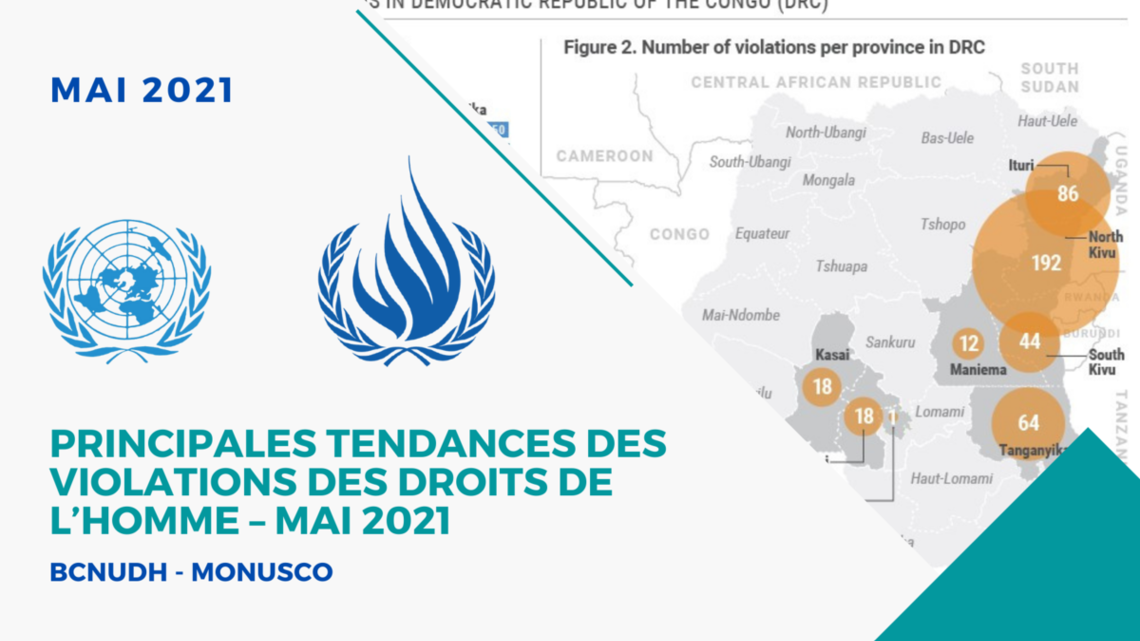 Durant le mois de mai 2021, le BCNUDH a documenté 534 violations des droits de l’homme sur tout le territoire de la République démocratique du Congo soit une augmentation de 24% par rapport au mois d’avril (429 violations). Cette augmentation résulte de la hausse du nombre d’atteintes attribuables aux membres des groupes armés (+31%) restés actifs dans les provinces affectées par le conflit et des violations attribuables à des agents de l’Etat (+17%). Les combattants des ADF ont multiplié les attaques contre des civils dans les territoires de Beni au Nord-Kivu et de Mambasa en Ituri, et les Maï-Maï Apa na Pale et Front patriotique pour la paix/Armée du peuple (FPP/AP) ont commis un nombre croissant d’atteintes notamment dans les territoires de Nyunzu au Tanganyika et de Lubero au Nord-Kivu respectivement.
