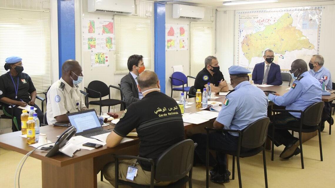 Réunis, le 11 février 2021 au quartier général de la MINUSCA à Bangui, la Police des Nations Unies (UNPol) et de la Mission de conseil de l’Union européenne en République centrafricaine (EUAM RCA) ont réfléchi sur les changements d’orientations et d’actions au profit des Forces de Sécurité Intérieure (FSI), afin de permettre aux autorités centrafricaines d'atténuer les défis auxquels le pays est actuellement confronté en matière de sécurité.
