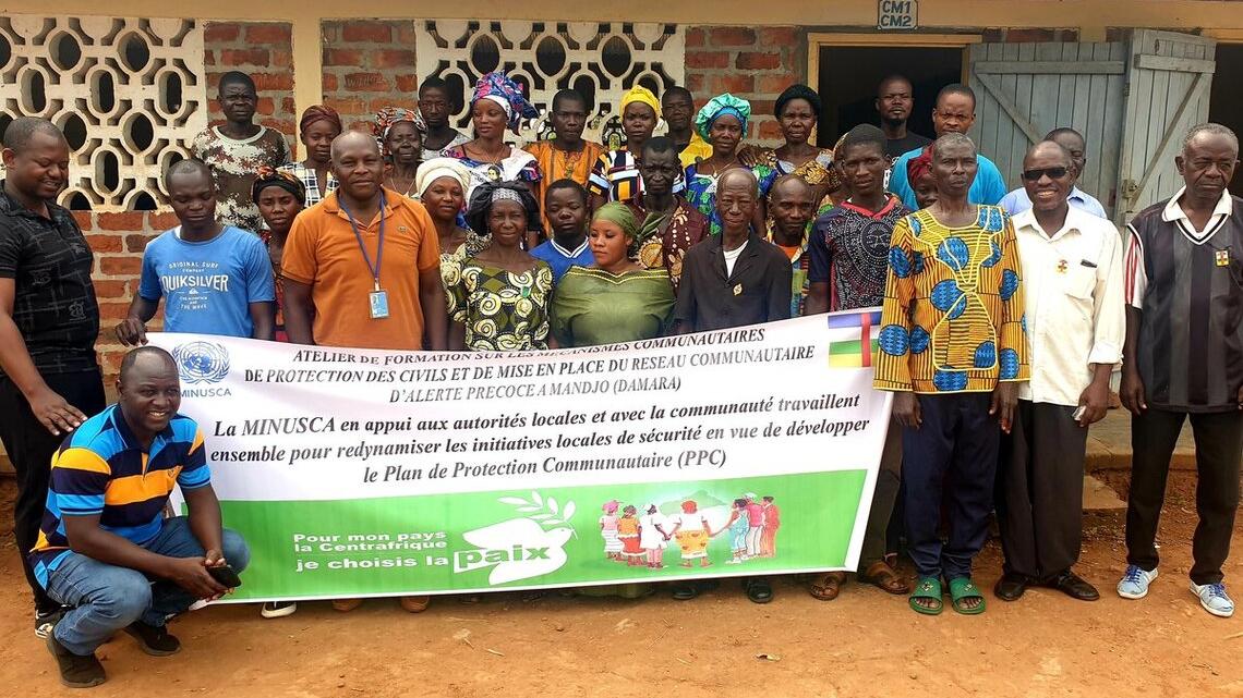 Un autre atelier axé sur l'établissement du réseau communautaire d'alerte précoce, l'élaboration du plan de protection communautaire de Mandjo et l'analyse des anciennes zones de soutien de la CPC (Coalition des Patriotes pour le Changement) dans la région a également été organisé le 6 mars 2024. Trente participants, dont 10 femmes, ont reçu des informations sur les outils de protection civile, les responsabilités des acteurs communautaires selon la loi centrafricaine, ainsi que sur la gestion de l'information et la désinformation.