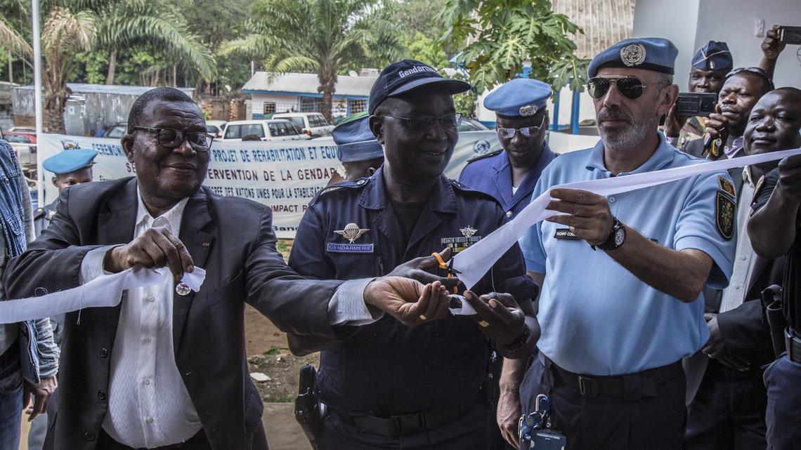 Pillés, saccagés et, en partie, détruits au cours de la crise socio-politique qu’a connue la RCA en 2013, les locaux du Groupement de sécurité et d’intervention de la Gendarmerie nationale (GSIGN) viennent de faire peau neuve grâce au Projet à Impact Rapide (QIP) de la Police des Nations Unies (UNPol). Le projet a permis d’effectuer des travaux de réfection des bâtiments de la Gendarmerie nationale et de mettre en place des commodités fonctionnelles et modernes. Il s’est agi de refaire la maçonnerie, la menuiserie, la plomberie, la peinture, l’électricité et la climatisation. L’institution a aussi été pourvue en équipements, dont le mobilier de bureau et le matériel informatique. Pour la MINUSCA, il était indispensable d’optimiser « les capacités opérationnelles de la gendarmerie et ainsi lui permettre de mieux servir et protéger la population » ; et ceci passe aussi par « l’évolution dans un environnement de travail quotidien agréable et adapté ». Les travaux ont été financés à hauteur de 26.000.000 de francs CFA, et le projet mis en œuvre par l’ONG SARAPHIRE. « La réhabilitation et l’équipement des locaux du GSIGN ont pour but d’améliorer considérablement les conditions de travail des personnels, et de faciliter la réaction dans les interventions, par la mise en place d’une section d’intervention permanente dotée d’outils fonctionnels », comme le souligne le Coordonnateur du Pilier Développement de la UNPol, le Colonel Taciano Alfredo Teixeira Correia, venu représenter le Chef de la composante police de la MINUSCA, lors de la remise des locaux, le lundi 19 novembre à Bangui, aux autorités compétentes, au nombre lesquels le Maire du 1er Arrondissement de Bangui, Jules ABEZOUA, le Directeur général adjoint de la Gendarmerie nationale, le Lieutenant-Colonel Célestin DOKOULA, et le Commandant du GSIGN, le Lieutenant-Colonel Didace NAMKIANGAA.