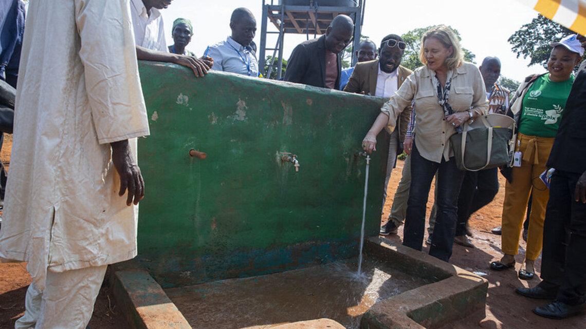La Représentante spéciale adjointe du Secrétaire général de l’ONU, Lizbeth Cullity, a indiqué aux bénéficiaires que : « Ce forage ne servira pas uniquement de point d’accès à l’eau potable pour la population de Pk55, mais aussi, et surtout, de point de rencontres, d’échanges et de partage qui contribuent absolument à renforcer la cohésion sociale entre les différentes communautés ».