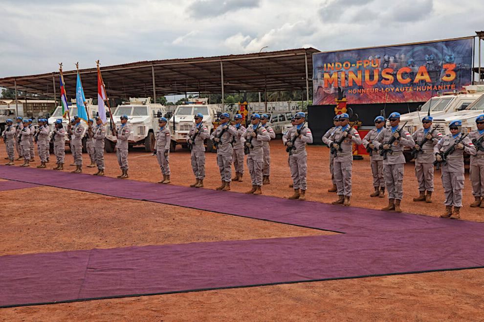 140 Casques bleus de l’Unité constituée de la police indonésienne, dont 18 femmes déployés au sein de la Minusca ont reçu la médaille des Nations Unies, le 10 aout 2022, après 11 mois de service en RCA, lors d’une cérémonie…