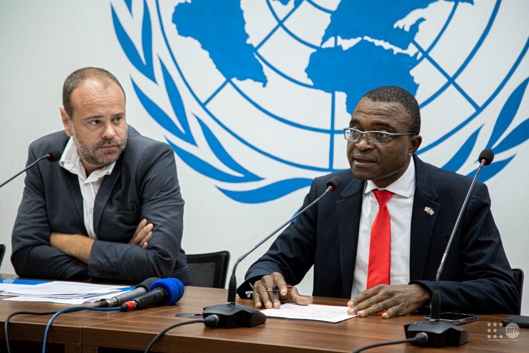 Le porte-parole de la MONUSCO, Mathias Gillmann et Représentant en RDC du Fonds des Nations Unies pour la population (UNFPA), Dr Eugene Kongnyuy. Photo UNFPA Journée mondiale de la population : la RDC pourrait compter 278…