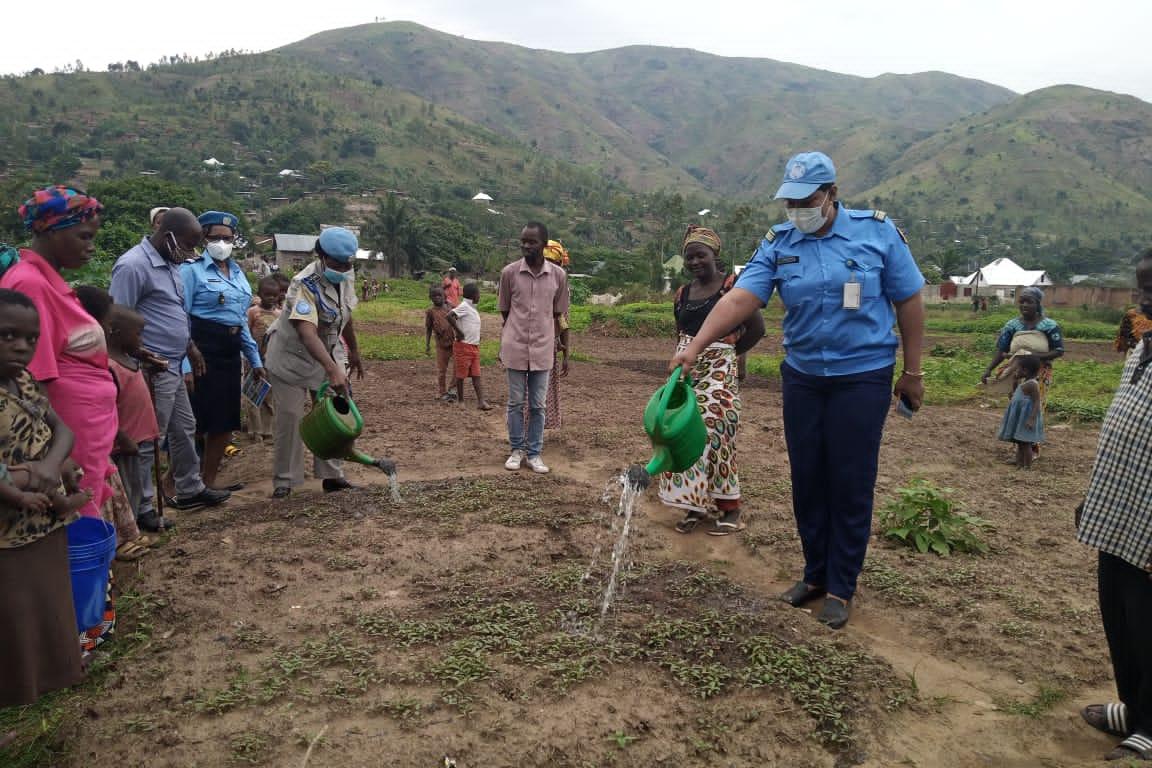 Les femmes policières UNPOL de la MONUSCO, RFUM Uvira, interagissent avec les femmes maraîchères de Rugenge (périphérie nord de la ville d’Uvira) après une séance de sensibilisation sur la protection des civils et l…