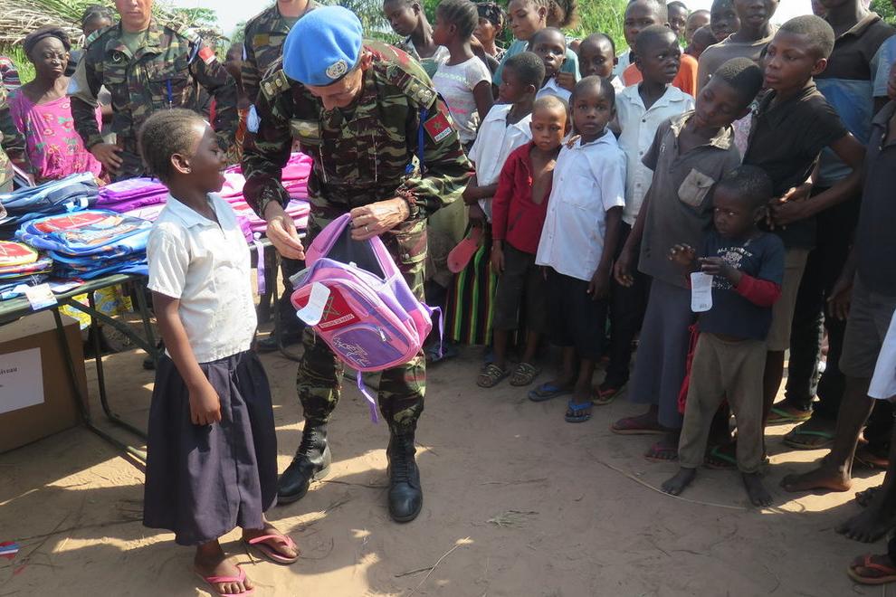 Le contingent Marocain de la MOUNUSCO assiste les élèves d'une école de Kananga. Photo MONUSCO/Laurent Sam OUSSOU Kananga, 22 mars 2019 - Le contingent Marocain de la MONUSCO a remis Jeudi 22 mars, un Kit scolaire contenant…