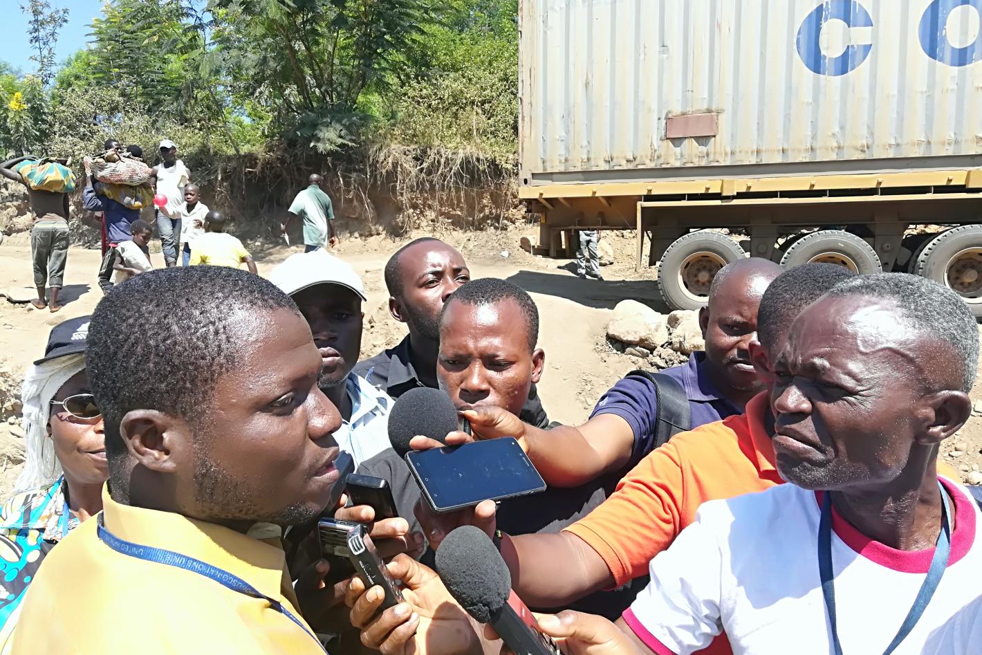 Les journalistes de la presse écrite et audiovisuelle sur le site de la déviation des eaux de la rivière Kawizi, en compagnie de l’ingénieur de la MONUSCO, M. ANANI Kossi, qui répondait à leurs questions. Photo MONUSCO…