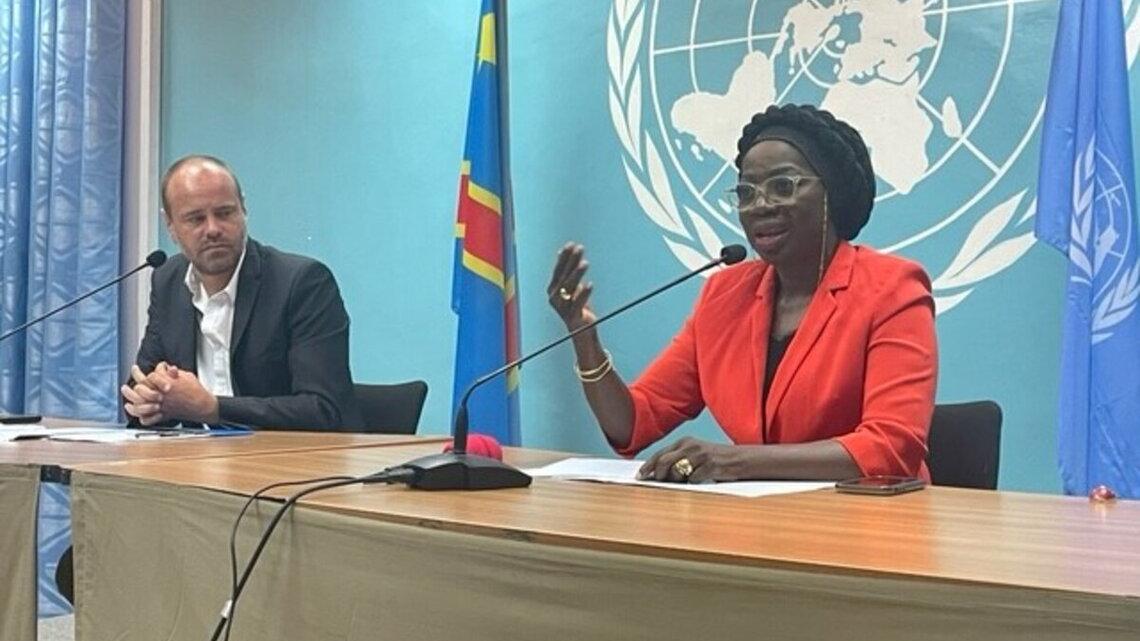 Le porte-parole de la MONUSCO, Mathias Gillmann et la Représentante d'ONU Femmes, Mme Awa Ndiaye Seck, lors de la conférence de presse Awa Seck, ONU Femmes RDC : « Je me lève et je m'engage aujourd'hui contre les violences…