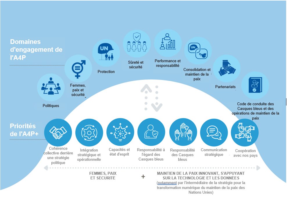Les sept priorités de l'A4P+ ont également pour but d'accélérer les progrès dans la mise en œuvre de la Déclaration d'engagements communs concernant les opérations de maintien de la paix des Nations Unies en accroissant son incidence et en relevant les défis actuels. Les priorités sont fondées sur une analyse des réalisations, des lacunes et des défis à relever pour faire avancer l'A4P depuis 2018. Parmi elles figurent deux thèmes transversaux : les femmes, la paix et la sécurité, et un maintien de la paix innovant, s'appuyant sur la technologie et les données, notamment par l’intermédiaire de la stratégie pour la transformation numérique du maintien de la paix des Nations Unies.