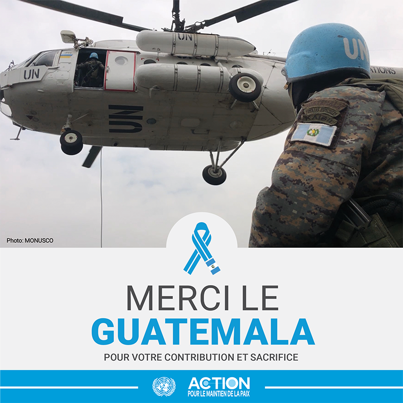 GuatemalaJuillet 2021 - Les Nations Unies remercient le Guatemala pour sa contribution inestimable au maintien de la paix. En chiffres : les Casques bleus guatémaltèques sont déployés à travers 7 mission Last updated: Lundi 7 février 2022 - 23:57Share