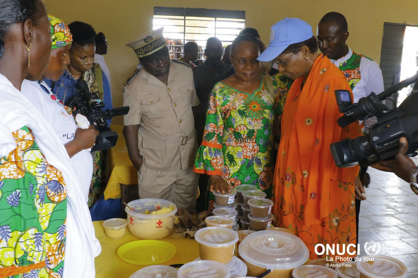 01 août 2016ONUCILes femmes de Niellé présentent à la Cheffe de l’ONUCI les condiments et épices, produits finis de leur coopérative Wowêla qui a reçu un financement de la Mission onusienne dans le cadre de son programme des Projets à impact rapide (Niellé, juillet 2016)