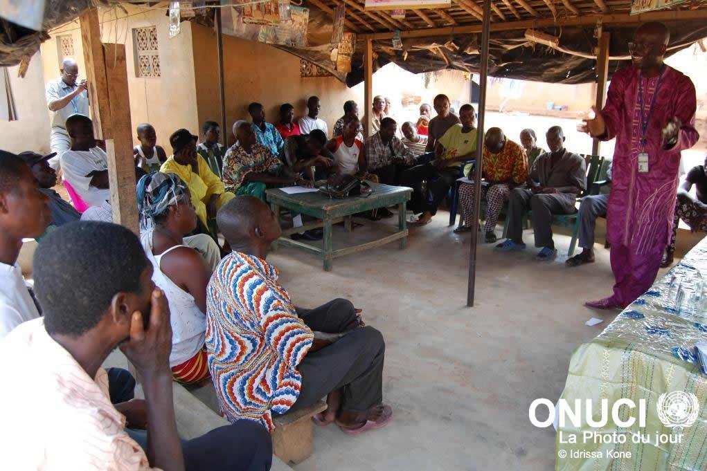 25 mai 2016ONUCIONUCI Tour in Claironkro: local communities’ leaders listening carefully to a member of the visiting delegation of the UN Mission who encourages them to strengthen social cohesion (Claironkro near Divo, May 2016)