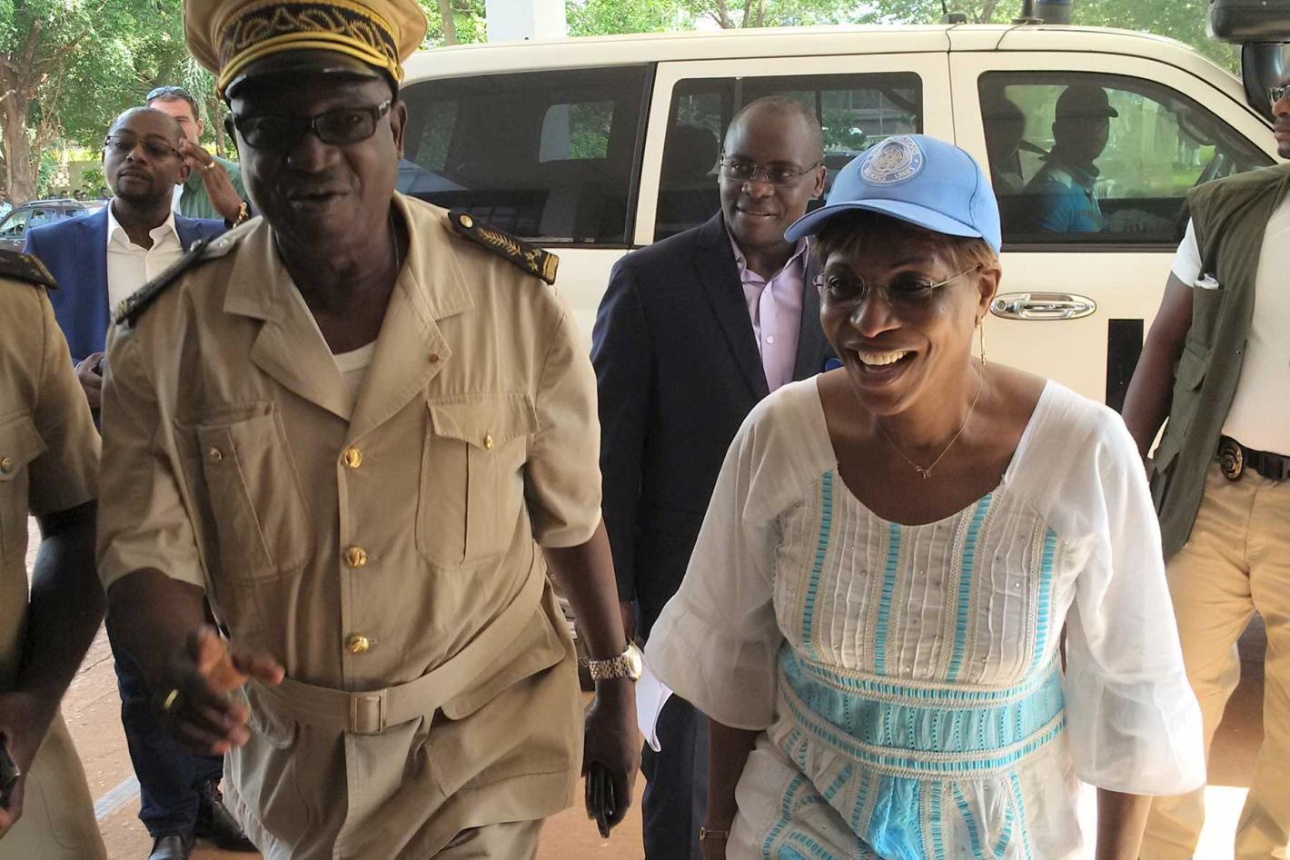 18 mai 2016ONUCILa Représentante spéciale, Aïchatou Mindaoudou, et le Préfet du Tonkpi, Jérôme Soro Kayaha, montant les marches de la préfecture de Man, réhabilitée grâce au programme de Projets à impact rapide de l'ONUCI (Man, mai 2016)