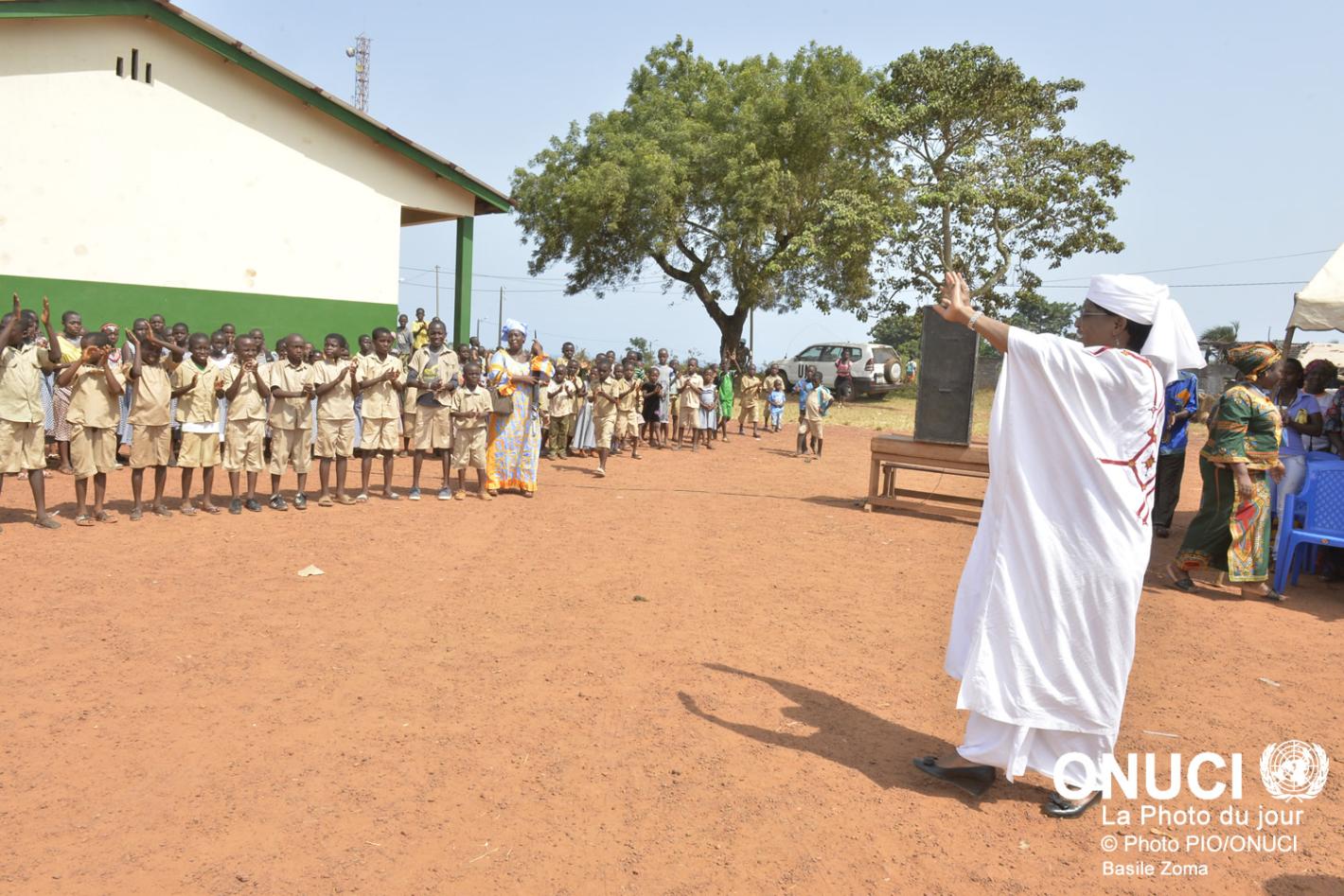 28 avril 2016ONUCILa Représentante spéciale accueillie par les élèves de l’école primaire publique de Tabou II, fraichement réhabilitée par l’ONUCI, dans le cadre de son programme de Projets à impact rapide (Tabou, mars 2016)