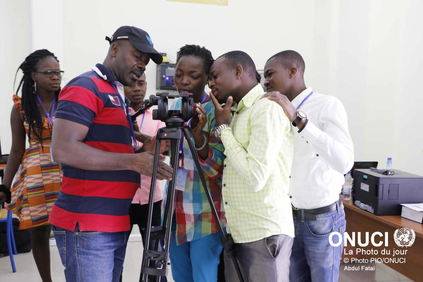 26 avril 2016ONUCIComment utiliser le trépied d’une caméra : explications données aux étudiants membres du Club de non-violence de l’Université Alassane Ouattara lors d’une formation en vidéo animée par l’ONUCI (Bouaké, avril 2016)
