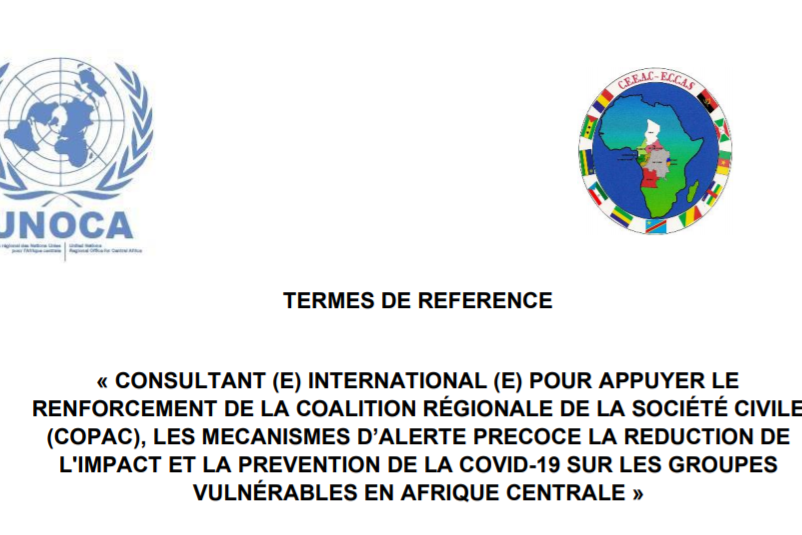 21 août 2020UNOCARECRUTEMENT D’UN(E) CONSULTANT(E) INTERNATIONAL(E) POUR UN APPUI AU RENFORCEMENT DE LA COALITION DES ORGANISATIONS DE LA SOCIÉTÉ CIVILE POUR LA PAIX ET LA PREVENTION DES CONFLITS EN AFRIQUE CENRTALE
