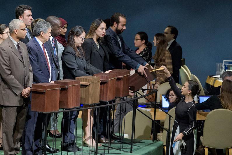 A l’Assemblée générale, une déléguée met le bulletin de son pays dans l’urne lors de l'élection de 18 nouveaux membres du Conseil des droits de l'homme pour un mandat de trois ans à compter du 1er janvier 2019. Photo ONU, M Elias